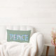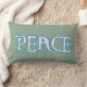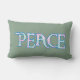 Ein sehr hübsches Lumbalkissen mit dem Wort "PEACE" in einem Drehbuch, das mit einem hübschen rosa und blauen Blumenmuster auf einem weichen grünen Hintergrund umrissen ist.