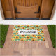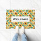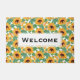 Begrüßungstürmatte mit einem niedlichen sommerlichen Muster. Hübsche gelbe Sonnenblumen, umgeben von grünen Blätter in einem sich wiederholenden Muster. Ein weißes Rechteck, oben platziert mit dem Text.