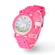 Diese Pferdeuhr für Mädchen ist mit einem hübschen Pony mit rosa Mähne und Schwanz ausgestattet. Sie ist stehend in einem Feld von Blume und einem wunderschönen blauen Himmelshintergrund mit der Sonne, die durch reizende pufffarbene weiße Wolken geht.