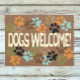Die Begrüßungsbotschaft der Hunde in einem lustigen Schriftart wird von einem mehrfarbigen Hundepfoten umrahmt. Liebe du Hundebesucher? Crawling dein Platz mit Hunden? Begrüßen Sie sie richtig mit einer lustigen Begrüßungsmatte. Das ist auch für Hundeunternehmen wie Groomer, Haustier-Sitter oder Tierarztbüro ideal.