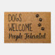 Herzlich willkommen bei dieser lustigen Tür! " Hunde willkommen , Menschen toleriert ". . Willkommen Doormat - Dog Paw Print Floor Mat. Rustikales natürliches Imitat mit schwarzem und schwarzem Design und Pfotendrucken. COPYRIGHT © 2022 Judy Burrows, Black Dog Art - Alle Rechte vorbehalten. Hunde willkommenMenschen toleriert rustikalen Coir Funny Dog Doormat