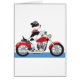 Ein Hund reitet ein rotes Motorrad. Seine Ohren, Schal und Schwanz fliegen in den Wind und sein Sturzhelm hat Knochenabziehbilder.