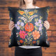 Südungarische Traditionskunst (Kalocsai) auf einem Throw Kissen. Ein lebendiger Bouquet, der die Wärme des Frühlings und des Sommers ausstrahlt. Lebhaftes Zuhause-Dekor im Magyar-Erbe .