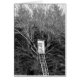 Schwarz-Weiß-Bild einer Jägerhütte mit einer Holztreppe auf einem Baum.