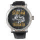 This wall clock features a humorous and assertive statement from a truck driver. Against a black background with a golden-yellow rim, it displays a white semi-truck graphic. The bold text "I DON'T SCREAM I'M A TRUCKER" is prominently displayed in a distressed golden-yellow and white font, making a witty declaration about the no-nonsense attitude often associated with professional drivers.