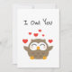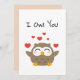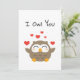 Kleine niedliche und fröhliche Eule-Illustration mit herumfliegenden Herzen. Ein lustiger Vogel in hellbraunen Farben und mit hellgelben Pfoten. Diese Eule bringt Glück und Liebe, und freut sich, Sie aufzurufen oder jemandem, den Sie mögen, beste Wünsche zu schicken. Sie können den Hintergrund auch für Ihre Bedürfnisse anpassen.