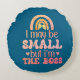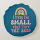Das Bild ist mit einem weißen, runden Kissen für Kinder mit einem spielerischen und farbenfrohen Design versehen. Das Design beinhaltet einen Regenbogen und die Phrase "Ich mag klein sein, aber ich bin der BOSS" in rosa und rotem Text, mit kleinen Herzformen betont. Dieser T - Shirt ist wahrscheinlich für Kleinkinder gedacht und vermittelt eine unterhaltsame und selbstbewusste Botschaft.