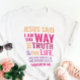 Christlicher T - Shirt mit dem biblischen Vers von Johannes 14:6 Jesus sagte ihm: "Ich bin der Weg, die Wahrheit und das Leben. Niemand kann zum Vater kommen, außer durch mich." Die Verse sind in orangefarbenen und rosafarbenen Farben und in gemischter Kalligraphie & minimalistischer Typografie. Dieses trendige, moderne Design ist das perfekte Geschenk- und Modestatement. #christlich #religion #scription #religion #bible #jesus