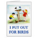 Ein skurriles Bild von Kindern, die Vögel gefüttert haben und sogar die Begleitung eines hungrigen Eichhörnchens genießen. Caption liest, ICH HABE NACH VÖGELN AUSGESTELLT. Eine niedliche Karte für Vogelliebhaber, die ausziehen.