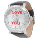 Ich Liebe Sie Text mit roten Bluttropfbuchstaben und eine Linie zeichnend einer weiblichen Hand mit einem Zeigefinger auf den Betrachter. Zum Spaß und zu Halloween. Armbanduhren. Sie können die Bilder ändern.