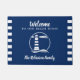 Herzlich willkommen in unserem Strandhaus Personalisiert mit Ihrem Familiennamen Entryway Doormat. Mit einem einzigartigen klassischen Leuchtturm aus dem 19. Jahrhundert auf wunderschönem Navy Blue.