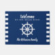 Herzlich willkommen in unserem Strandhaus Personalisiert mit Ihrem Familiennamen Entryway Doormat. Mit einem einzigartigen, klassischen Nautical Ships Wheel Helm auf schönem Navy Blue.