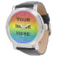 Benutzerdefinierte Uhr mit gelben Zahlen Sheer 40% Diese benutzerdefinierte Uhrenvorlage mit halbtransparenten gelben Zahlen (40% Schere) fügt Ihrem Hintergrundbild oder Foto einen schönen Farbakzent hinzu. Die Fallschatten geben den Zahlen in diesem flach gedruckten Zeitstück einen geprägten, fast 3D-Look. Dieses Design passt besonders gut zu goldenen, roten, orangefarbenen und anderen warmen Hintergründen. Es fügt sich harmonisch in den grünen und coolen Hintergrund ein. Um dieses Produkt anzupassen, laden Sie Ihr eigenes Hintergrundbild oder Foto wie oben gezeigt hoch. Klicken Sie auf die Schaltfläche "Anpassen!" unterhalb des Produktabbilds, um die Größe der Position zu ändern oder anzupassen. Auch die Position der Zahlen auf der Uhr kann nach Ihren Wünschen angepasst werden, indem das transparente Uhrzeigerbild verändert wird. Sie können auch Ihren eigenen Text und/oder andere Bilder hinzufügen, wenn Sie dieses Design weiter personalisieren möchten.