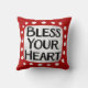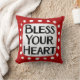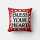 "Bless Your Heart" ist ein niedliches Textdesign in rot mit schwarzem Text, zusammen mit einer weißen Akzent-Form und weißen texturierten weißen, weißgetönten weißen Punkten, die ihn umgeben.