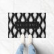 Ikat Textil Muster individuelle Begrüßungstürmatte. Fügen Sie Ihre eigene Nachricht, Familienname, Monogramm, Nachname oder lustiges Zitat hinzu. Luxuriöse Geschenkidee für neue Zuhause / Hauswärmung oder Verlobung / Hochzeitsfeier. Schwarz/Weiß oder Farbhintergrund. Stilvolle, moderne Typografie mit Liniendruck. Anpassbare Dokumentvorlagenvorlage. Erstellen Sie Ihre eigene Eintrittstafel / Teppich für Eingangstür / Eingangstür oder Halle / Veranstaltungsort. Wohngestaltung / Dekoration für Ihr Haus individuell. Fügen Sie Ihre eigenen Monogramm Buchstaben Initialen oder Nachnamen hinzu. Schönes Modedesign für moderne Zuhause.
