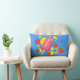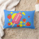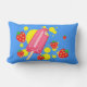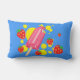 Ein Kissen aus der Lumbalbar mit einem sommerlichen Thema. Entworfen mit einem rosa Popsikel und einigen roten Erdbeeren und gelben Farbspritzen. Blauer Hintergrund.
