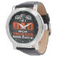 This personal wall clock proudly announces a truck driver's dual identity as a dad and a trucker. Against a black background with a pink rim, it features three semi-trucks at the top and the bold text: "I'M A DAD AND AN TRUCKER NOTHING SCARES ME". It's a perfect gift for a fearless father who conquers both the road and family life with equal bravery. The design tool can also be used to add custom text if you want your name or company on this clock. You can customize the color of the frame to any color you desire by going into the design tool.