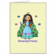 Im Garten arbeitenprinzessin hält einen Gartenspaten und einen Blumentopf voll von den hübschen Blumen! Die perfekte Prinzessin für Mädchen die Liebegartenarbeit.