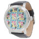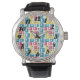 Die Armbanduhr dieser Herren hat ein modernes Design aus abgerundeten Rechtecken, von denen einige mit Sternexplosionen versehen sind, in Retrofarben Rot, Gold, Grün und Türkis. Wenn Ihnen das Design gefällt, aber andere Farben bevorzugen, dann schreiben Sie mir.