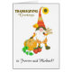 Eine lustige Erntedank-Grußkarte für Sie zu personalisieren, mit einem niedlichen Gnome mit einem langen weißen Bart und einem sehr hohen, spitzen Hut, mit einer Sonnenblume befestigt und einige Herbstlaube in seinem Hassband stecken. Laut der skandinavischen Legende leben diese Zwerge unter abgelegenen Bauernhäusern und sorgen dafür, dass die Bauer sich um ihre Ernte und Vieh kümmern. Der Gnome hat in der einen Hand ein paar Weizenstähle, seine andere Hand ruht auf einem Kürbis und neben dem Kürbis gibt es rosige rote Äpfel. Der Gruß auf der Vorderseite ist "ERNTEDANK Greetings" in dunkelbrauner Farbe, passend zum Brathorband, Faustschuhen und Fingerhandschuhen, und es gibt unten Platz für Sie, um die Namen der Empfänger/s hinzuzufügen. Die Insider-Nachricht ist nur ein Vorschlag, und Sie können sie einfach ändern oder ganz entfernen, wenn Sie eine "leere Innenseite" Karte bevorzugen.