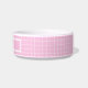Schachtelhundefutter oder Wasserschüssel mit einem dänisch pastellrosa Gitter und personalisiert mit einem Namen. Ein modernes und farbenfrohes ästhetisches Produkt für Ihre Haustiere.