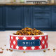 Adorable individuelle Name Haustierfutter-Schüssel mit einem stilvollen roten Gingham-Muster und blauem Etikett. Personalisieren Sie es, indem Sie den Platzhalter-Text ersetzen. Für weitere Optionen, wie zum Beispiel den Schriftart zu ändern und seine Größe, klicken Sie auf die Schaltfläche "Anpassen". *Bitte beachten Sie, dass das Zazzle-Wasserzeichen, das in der Zoomvorschau angezeigt wird, nicht auf dem gedruckten Endprodukt angezeigt wird. © Rosewood and Citrus