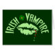 Ein Paar grüne Lippen mit den Tropfen des roten Bluts gemischt mit den Kleeblättern, die unten tropfen, veranschaulicht die Wörter "irischen Vampire." Große Pubschleichenabnutzung, zum des Koboldbluts zu sind zum Kotzen und mit grünem Bier unten sich zu waschen.