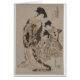 Dieser japanische Farbdruck wurde im 18. Jahrhundert von Isoda Koryusai (1764 - 1788) gemacht. Der Name auf japanisch ist: "Hinagata Wakana kein Hatsu Moyo". In ihm sehen wir eine japanische Dame und ihre zwei Begleiter, ganz gekleidet in schön entworfenen lang flüssigen Kimonos mit hübschen Blumenentwürfen. Die Dame trägt auch irgendeine Art des Mantels oder des Schals, die einen Fisch darstellt, der gegen den Strom schwimmt oder in einen Wasserfall. Der japanische Künstler verwendete größtenteils helle Farben in diesem Druck - beige, braun, im Weiß und im Schwarzen. Wie, unterzeichnete die Gewohnheit in Japan Isoda Koryusai seinen Namen in den Kanjicharakteren und in den Hiragana (japanisches Schreiben).