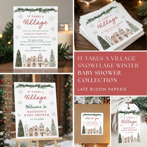 Dress up your beverage bottles with these It Takes a Village baby shower wine labels. The charming design features a watercolor village nestled between evergreen trees with snowflakes and a greenery garland across the top. “It Takes a Village” appears in festive red script above customizable text for the mom-to-be’s name and shower date. Perfect for winter or holiday baby showers, these labels add a cozy, coordinated touch to your party décor and make lovely favors or display accents.