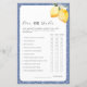 Viel Spaß beim Brautparty/Bachelorette mit diesem coolen Spiel, mit weißer Aquarelllemon-Blüte und bearbeitbarem Text. Passen Sie es an, wenn nötig, indem Sie auf "Bearbeiten mit dem Design-Tool" klicken.