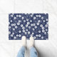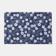Vector Illustration von stilisierten weißen Sakura Kirschblüten Blume und Wirbel auf blauem Hintergrund. Inspiriert durch traditionelle Kimono-Stoffmuster aus Japan.