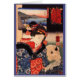 Vintage Illustration einer japanischen Frau in Kimono mit ihrer Katze, die die Zeitung liest.