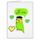 Ein grüner Parakeet, der ein stilvolles schwarzes Barett und ein Sprichwort "ich Liebe Sie" auf französisch trägt
