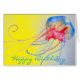 Original art drawn illustration of a jellyfish painted in watercolour by artist Sacha Grossel. This whimsical sea creature is on beach themed background of yellow sand and blue ocean. Auf Customisable jellyfish birthday card.