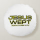 Dieses runde Kissen präsentiert ein Design, das die Worte "Jesus Wept" mit der Bibelschrift König James John 11:35 in einem kühnen Druck mit Gelb- und Schwarzbriefen mit gelber und schwarzer Kontur sowie einer Bibelziitation unter diesem religiösen Bibelthema präsentiert. Dieses Kissen ist aus hochwertigem Stoff gefertigt, unsere Kissen sind weich und faltenfrei, die Abdeckung ist maschinenwaschbar.