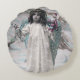 Eine Vintage französische Weihnachtspostkarte aus dem öffentlichen Bereich. Es zeigt ein Mädchen, das als Weihnachtsengel gekleidet ist und Geschenke trägt.