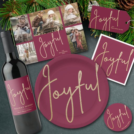 Weihnachtskarten mit mehreren Fotos tragen Ihre Namen und das Wort "Joyful" in schicken Schriften auf Cranberry-Hintergrund. Laden Sie einfach Ihre Lieblings-Fotos hoch und fügen Sie Ihre Personalisierung auf der Rückseite hinzu. Wählen Sie High Definition für beste Foto-Qualität. Der Live Design Service hilft Ihnen bei der Gestaltung Ihrer Fotos.
