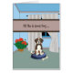 Jubiläumskarte Ihres illustrierten Bernarddogs, die verspricht, gut zu sein, wenn Sie zum Abendessen gehen, um Ihr Jubiläum zu feiern. Er will jedoch, ihm oder ihr etwas zurückzubringen. Der Hund sitzt in einem illustrierten Raum auf einer Bohnensasche mit einer rot getöpften Geranin-Pflanze in der Ecke. Die Wände sind blau und der Vorhang beige. Dank Pixabay, und der Hungryjpeg, für einige der Elemente im Design.