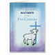 Das Schaf steht vor einem blauen Kreuz auf dieser katholischen Gratulationskarte, wenn man das erste Geständnis eines Jungen feiert. Mit der benutzerdefinierbaren Karte können Sie seinen Namen für einen wahren Sake auf seiner ersten Versöhnung hinzufügen.