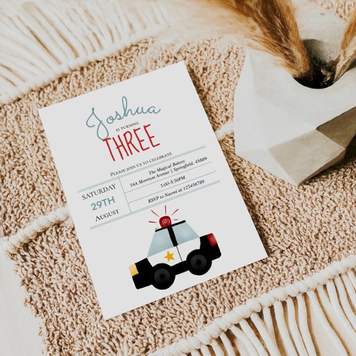 Dieses niedliche und moderne Kindergeburtenservikdesign verfügt über einen Polizeiwagen-Cartoon, der an den Rändern ein passendes blaues Polizeimuster aufweist und mit dem Namen Ihrer Jungen personalisiert werden kann. Die perfekte Ergänzung zum Geburtstag Ihres Kleinkindes zum Thema Polizei.