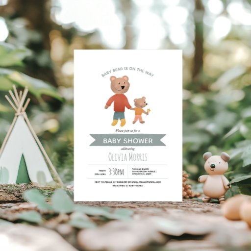 Dieses niedliche und moderne Baby Boy Duschkabine Design verfügt über ein Elternbär und einen Babybär. Es gibt auch Platz für Sie, um den Namen und das Datum Ihrer Mütter in Ihrem Waldland Party hinzuzufügen.