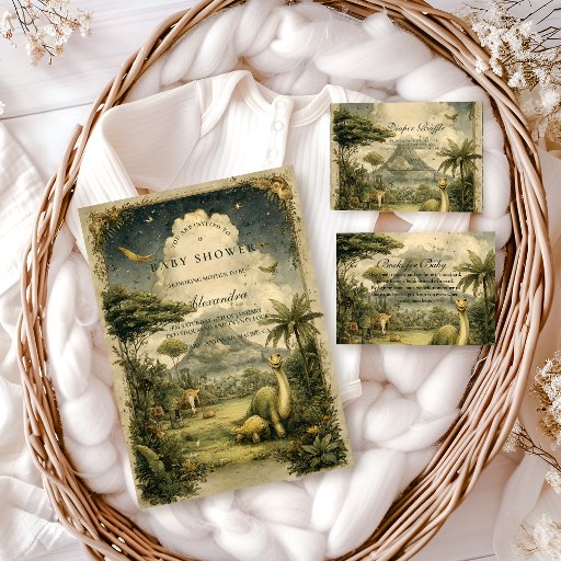 Step into a lush prehistoric paradise with this vintage-style dinosaur design. Featuring palm trees, ferns, and gentle dinosaurs in warm earthy tones, it’s perfect for a baby shower with adventure and charm. A timeless blend of tropical greenery and whimsical Jurassic nostalgia.