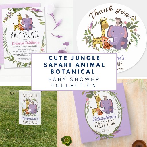 Dieses süße Tier Safari-Design umfasst einen Elefanten, Giraffe, Tiger und einen Affen, umgeben von einem Dschungel-Botanischen Blattmuster. Diese beliebte Typografie kann angepasst werden, um die Farbe und den Schriftart Stil zu ändern oder behalten, wie es für Sie ist. So niedlich für einen Jungen oder eine Babydusche.