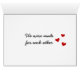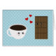 Eine niedliche kawaii Schale Kaffee und Bar der Schokolade, betrachten süß gegenseitig, wenn drei rote Herzen zwischen sie schwimmen. Der Hintergrund ist mit Tupfen hellblau. Das Innere der Karte sagt, dass "wir für einander" gemacht und die gleichen drei Herzen von der Front nahe bei ihr haben wurden.