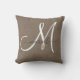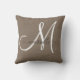 Personalisiertes Kakaobraun-weiß mit Monogramm Kissen mit einem Script-Schriftart über dem Design auf einem bedruckten Imitat graue Leinen Foto Effekt Hintergrund. Neutrale Farben, die mit muscheligen Farben oder anderen neutralen Farben übereinstimmen und kontrastieren.