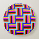 Ein gewagtes, kontraststarkes geometrisches Muster, das aus wiederholt gestreiften, runden Kissen in lebhaften Farbtönen Rot, Gelb, Magenta, Orange und Schwarz besteht. Jeder Block wechselt zwischen horizontalen und vertikalen Streifen, gerahmt durch starke blaue Kanten vor himmelblauem Hintergrund. Das Layout erzeugt einen gewebten, fast optischen Täuschungseffekt, als ob das Muster in einem rhythmischen Tanz von Farbe und Ordnung verflochten wäre. Es ist spielerisch, laut und unmöglich zu ignorieren.