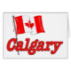 In den großen roten Briefen wird Calgary, eine große Stadt in der Provinz Alberta, mit einer wavy kanadischen Flagge, die dahinter fliegt, beschrieben. Dieses Design ist auf einer großen Auswahl an T - Shirt, Geschenken und anderen Bekleidung erhältlich.