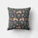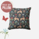 Ein Kissen mit einem originellen Design, inspiriert von skandinavischer Folklorekunst. Eine bezaubernde Welt aus wilden Kaninchen, Vögeln, Wildblumen und Schmetterlingen in einer Palette von ruhigen Blautönen, lebhaften Rot und üppigen Grün vor einem Hintergrund von Schwarz.