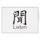 Das japanische Kanji-Symbol für das Wort "Hören" wird in kalligraphischen Pinselstrichen gezeigt und sieht sehr cool auf einem Hemd, einer Tasche, einer Kappe oder einem Knopf aus. Wir haben sogar die englische Übersetzung hinzugefügt, sodass die Leute die Nachricht bekommen. Das Design für das Zeichen basiert auf einem Gateway mit einem Ohr im Inneren. Hübsch cool! Sie können die Hintergrundfarbe ändern und auch Text hinzufügen.