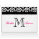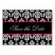 Schwarzes und heißes Rosa-Damast-Monogramm-Save the Date Karten. Fertigen Sie auf dem Innere mit Ihren Hochzeitsinformationen unter Verwendung der Aufforderungen besonders an oder wählen Sie "besonders anfertigen" für mehr redigierende Wahlen vor. Plan und Entwurf durch Elke Clarke ©2010. Damastmuster genehmigt für kommerziellen Gebrauch. Keine Verdopplung erlaubt.